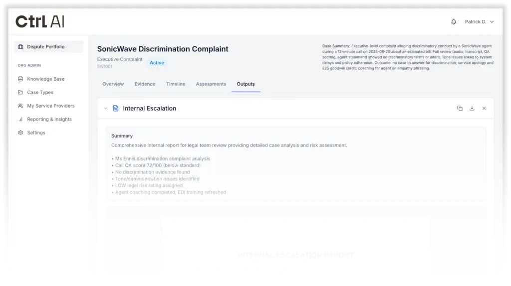 Every human decision is supported by transparent reasoning, referenced evidence and a complete audit trail. Ctrl AI generates clear, regulator-ready outputs that explain how conclusions were reached, helping teams respond confidently to customers, ombudsmen and internal review.
