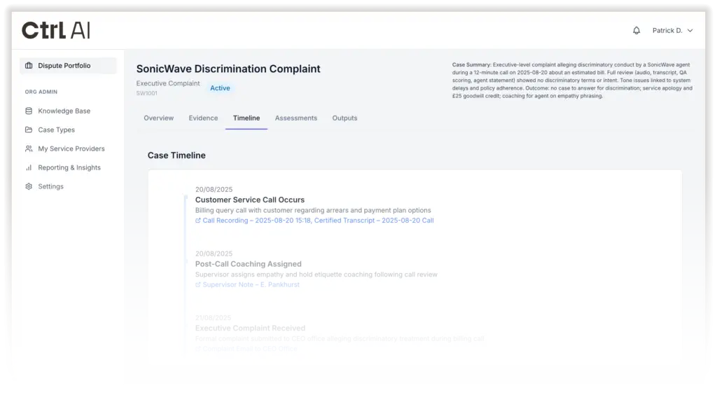 Ctrl AI brings structure to every case by analysing documents, emails, call recordings and case data in one place. Evidence is organised into a clear, searchable chronology, surfacing key facts, risks and inconsistencies instantly.